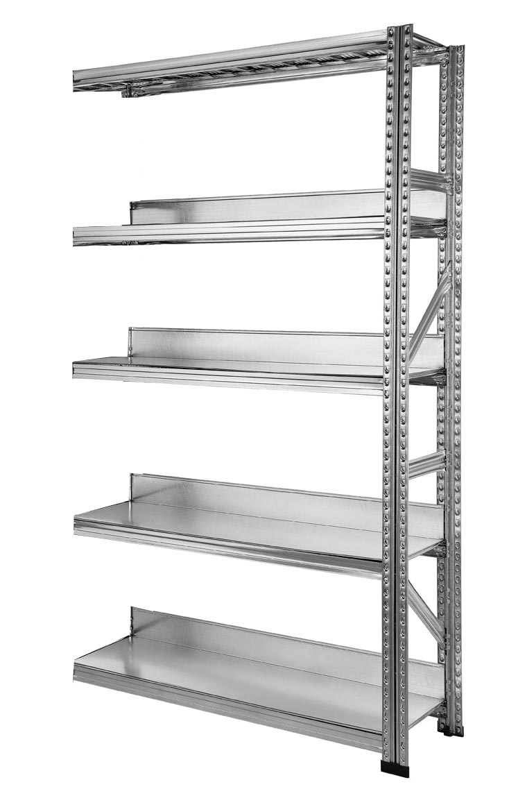 Kit suivant rayonnage Galvastar L.1200 x P.500 mm1 ?chelle H.1972 mm4 niveaux tablettes ?quip? d'une t?le lisse avec but?e arri?re hauteur 100 mm 1 niveau tablette simple.Caract?ristiques techniquesTablettes r?glables en hauteur tous les 33 mm. Charge maxi : 180 kg par niveau. DimensionsHors tout : L.1240 x P.500 x H.1972 mm
