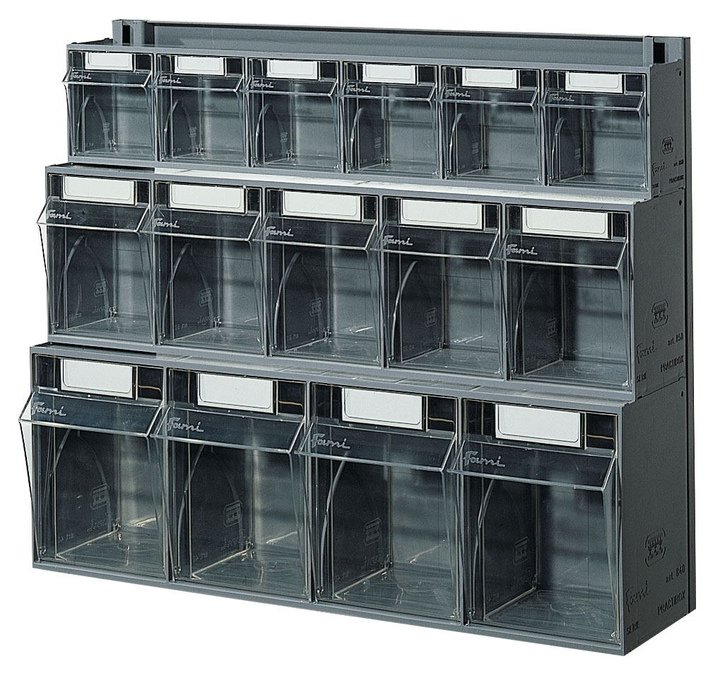 Pr?sentoir avec 15 tiroirs basculants r?alis?s en plastique ABS inalt?rable et transparent. Avec cadre support mural compris. Compos? de :- 1 bloc de 6 tiroirs- 1 bloc de 5 tiroirs- 1 bloc de 4 tiroirsDimensions : H. 500 x L. 600 x P. 170 mmPoints forts :Tiroir transparent pour voir le contenu des tiroirs. Pr?hension facile des objets stock?s gr?ce au basculement des tiroirs. Domaines d'utilisations : Ce module Praticbox 15 tiroirs permet de stocker de petites pi?ces d?tach?es ou fournitures de type ?lectriques (cosses, fils...), m?caniques (boulons, visseries...) avec une utilisation polyvalente par diff?rentes activit?s (garagiste, ?lectricien, plombier, industrie m?canique...).Etiquettes cartons en option.