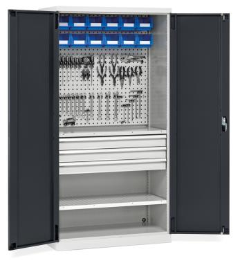 Armoire professionnelle mod?le Mont Cenis n?5Armoire grande capacit? ?quip?e avecStructure m?tallique monobloc. 2 tablettes L.955*P.500*H.30 mm perfor?es sur toute la surface. Charge maxi par tablette : 100 kg. Tablettes r?glables en hauteur tous les 25 mm.3 tiroirs H. fa?age100 mm en simple extension ? 87%. Charge maxi 50 kg par tiroir. 2 panneaux perfor?s L.955*P.500*H.30 mm positionn?s sur le dos de l'armoire.4 barres d'accrochage L.445*P.9*H.86 mm galvanis?es, pour fixation des bacs ? bec sur les panneaux perfor?s 12 bacs ? becs bleus 3,8 litres 1 kit crochets multi-fonctions 2 portes battantes avec serrure double s?curit?. A noter : les crochets porte-outils ne sont pas compris dans cette armoire. Possibilit? de les commander en optionCaract?ristiquesPeinture cuite au four Gris clair RAL 7035 + Gris anthracite Ral 7016 Fabrication en t?le acier 1?re qualit?.Serrure 3 points.DimensionsHors tout : L.1023 x P.555 x H.2000 mm Poids total : kg.Domaines d'utilisation L'armoire Mont Cenis n?5 dispose d'un volume important pour stocker vos fournitures ou votre outillage dans votre entreprise. Les panneaux perfor?s sur le dos de l'armoire permettent de fixer des crochets porte-outils.En option, il est possible de commander des accessoires ? fixer sur les panneaux perfor?s (exemple : crochets porte-outils, petites ?tag?res r?versibles, poche porte-documents...)