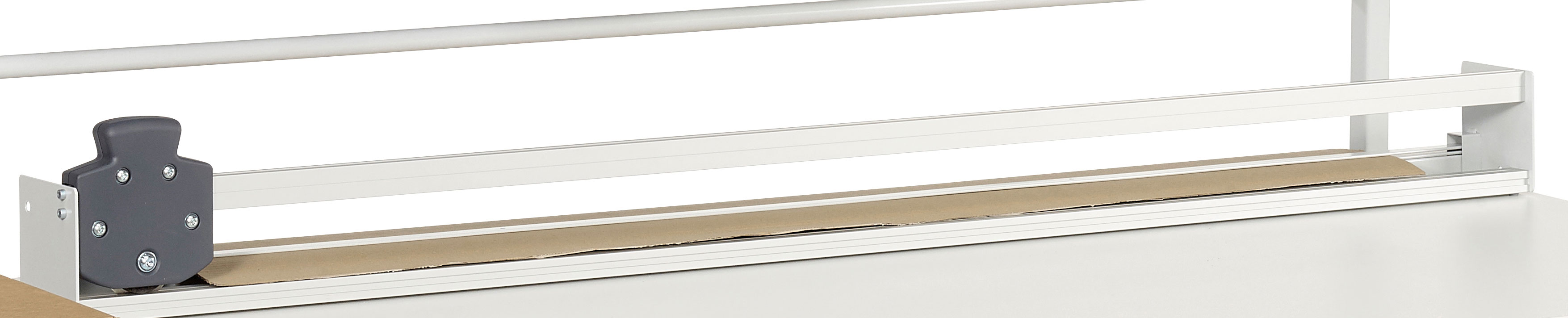 Couteau pour d?coupe du papier et carton sur poste d'emballage. Structure m?tallique en acier avec peinture ?poxy gris clair RAL 7035. Largeur de coupe 1550 mm. Peut ?tre fix? sur le plan de travail.DimensionsL. 1785 x P. 130 x H. 200 mm.Poids : 16 kg. Utilisations Ce couteau ? lame circulaire d?coupe facilement le papier et le carton.