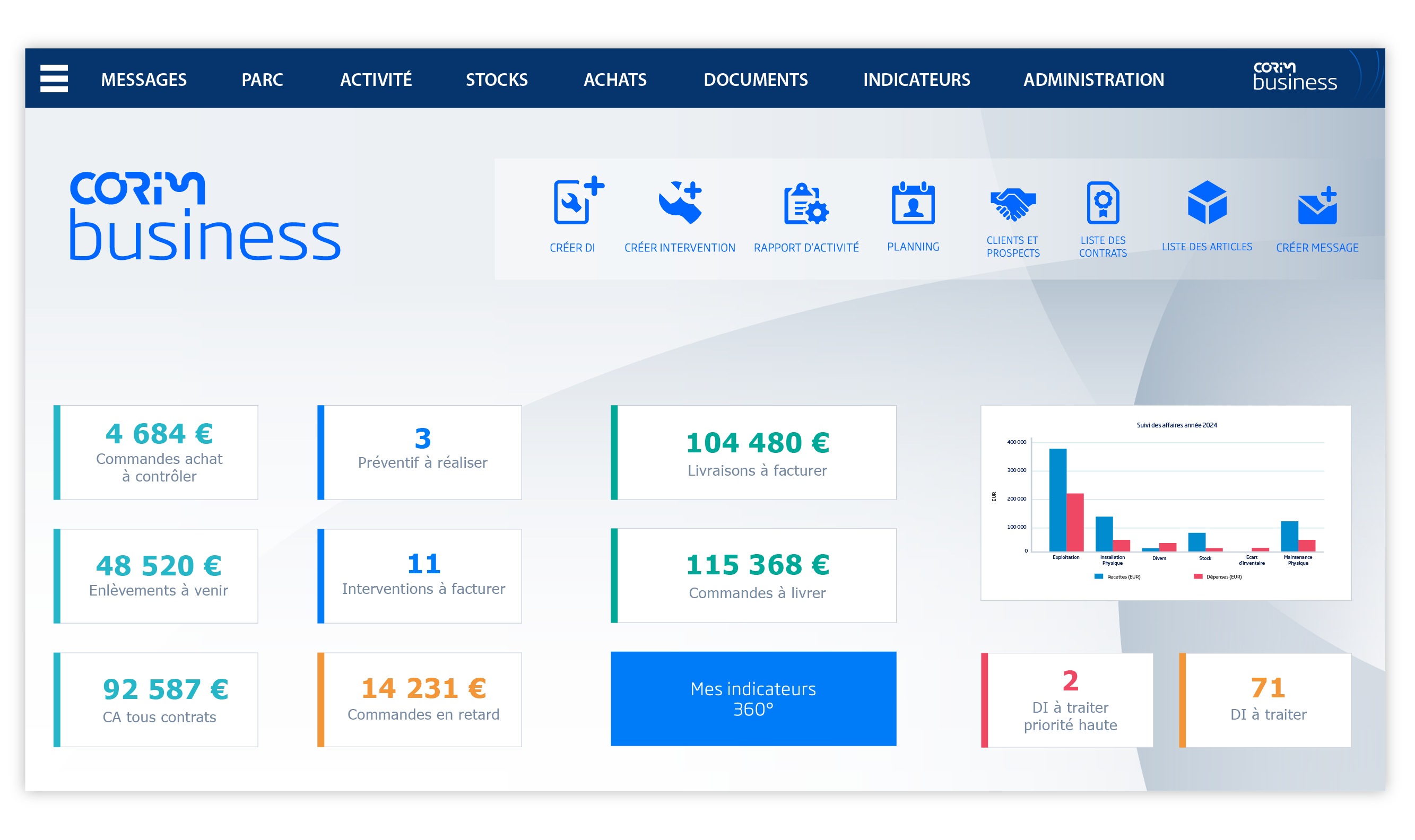 Corim Business est une solution complète de GMAO (Gestion de Maintenance Assistée par Ordinateur), et FSM (Field Service Management), conçue pour accompagner les SAV et professionnels de maintenance dans la gestion de leurs interventions, de la relation client, des contrats de maintenance, des ventes et de la facturation.