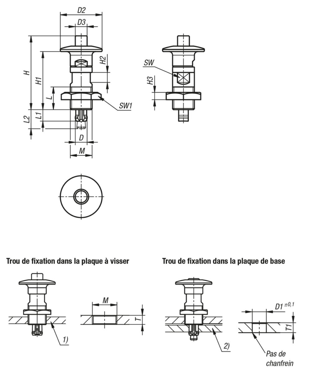 Broches de fixation en inox avec bouton de manœuvre en inox