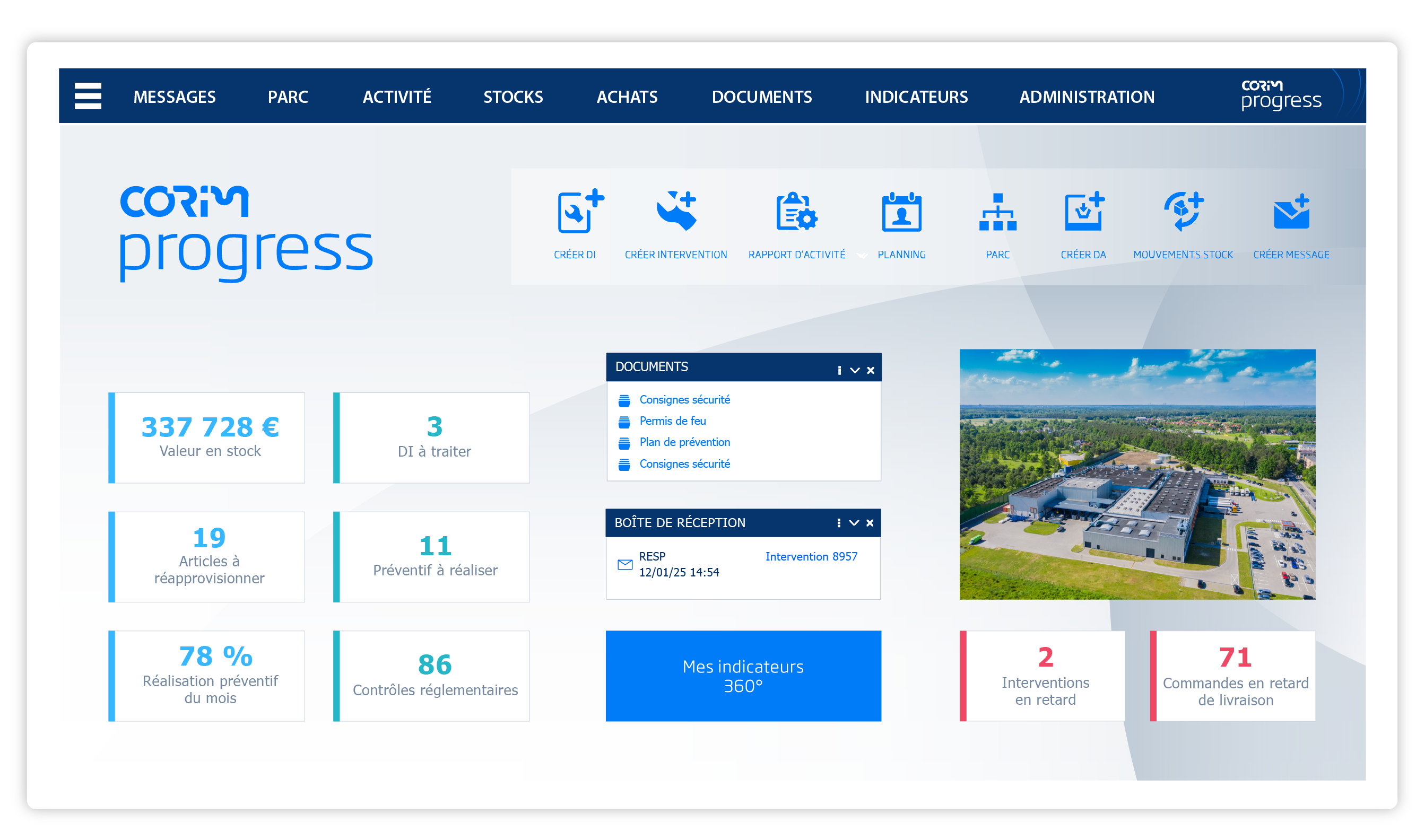 Adapté aux PME comme aux grands groupes, le logiciel GMAO Corim Progress permet de centraliser la gestion des équipements, de planifier les opérations de maintenance, de suivre les stocks de pièces détachées et d’analyser les coûts maintenance, qu’il s’agisse d’équipements industriels, d’installations tertiaires ou immobilières.