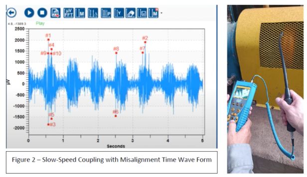 Figure 2 is an ultrasound signal captured of a slow-speed coupling that is misaligned. Every rotation there is a large peak. There is noticeable difference in the μV between the two ultrasound time wave forms.