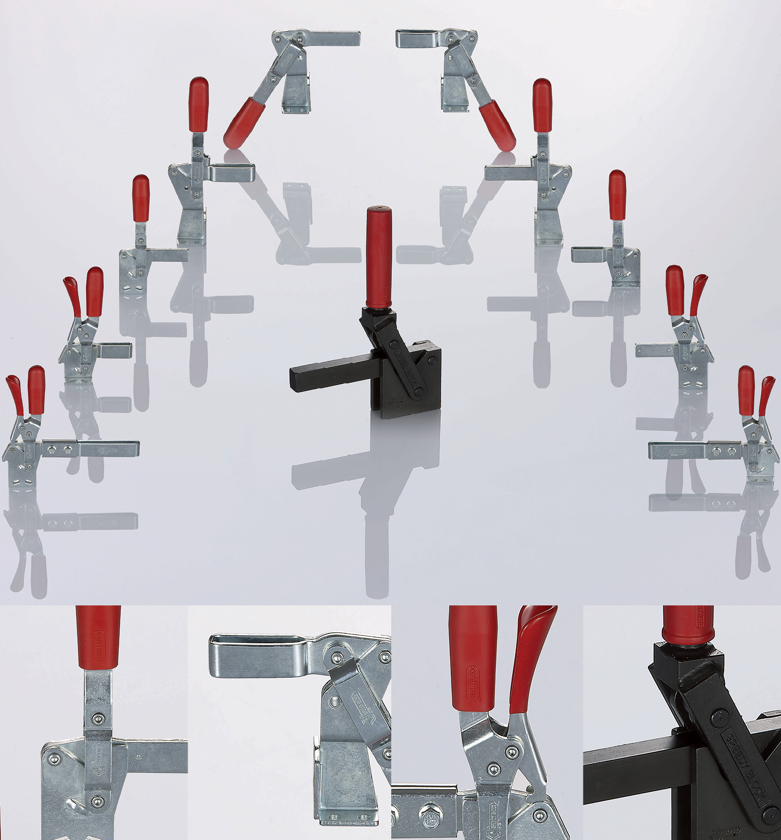 The clamping and control levers move in the same direction. Once tightened, the control lever is in a vertical position. Also available in stainless steel. These clamping tools can be used for closing molds for foams, polyurethanes etc. In order to prevent any accidental opening, caused by vibrations, some tools of this series are equipped with a safety lever, designed to keep the tightening while closed. This security lever allows to block the item also in the open position. The special extension of the locking arm of some of these tools enable the use also with the control templates.