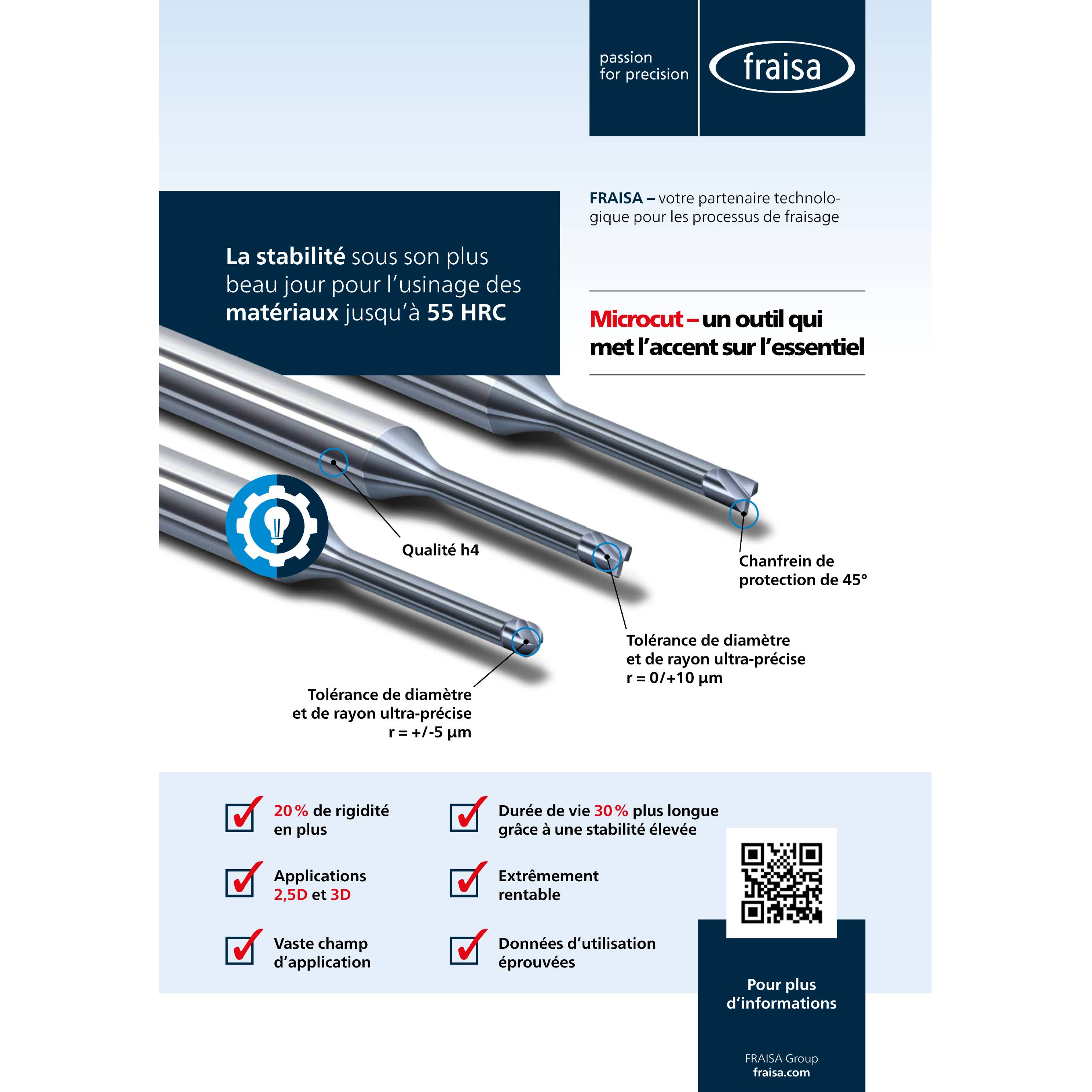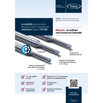 The quality partner for better productivity FRAISA, leader in its branch of activity, has been designing and manufacturing high quality cutting tools for all industries for more than 70 years. The availability of stock as well as the exhaustive ranges of tools for monobloc milling, milling with inserts or removable heads, tapping and drilling al...