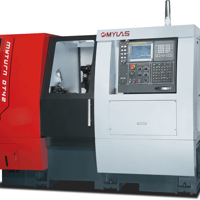 MYLAS DT65 - twin-spindle, twin-turret lathe DT65 With robotization option, automation Rigidity - Precision - Repeatability BARS - BILLETS Aerospace - Electronics - Hydraulics - Medical - Pneumatics ? Twin-spindle lathe ? Twin-turret BMT 45 with to