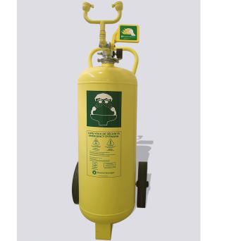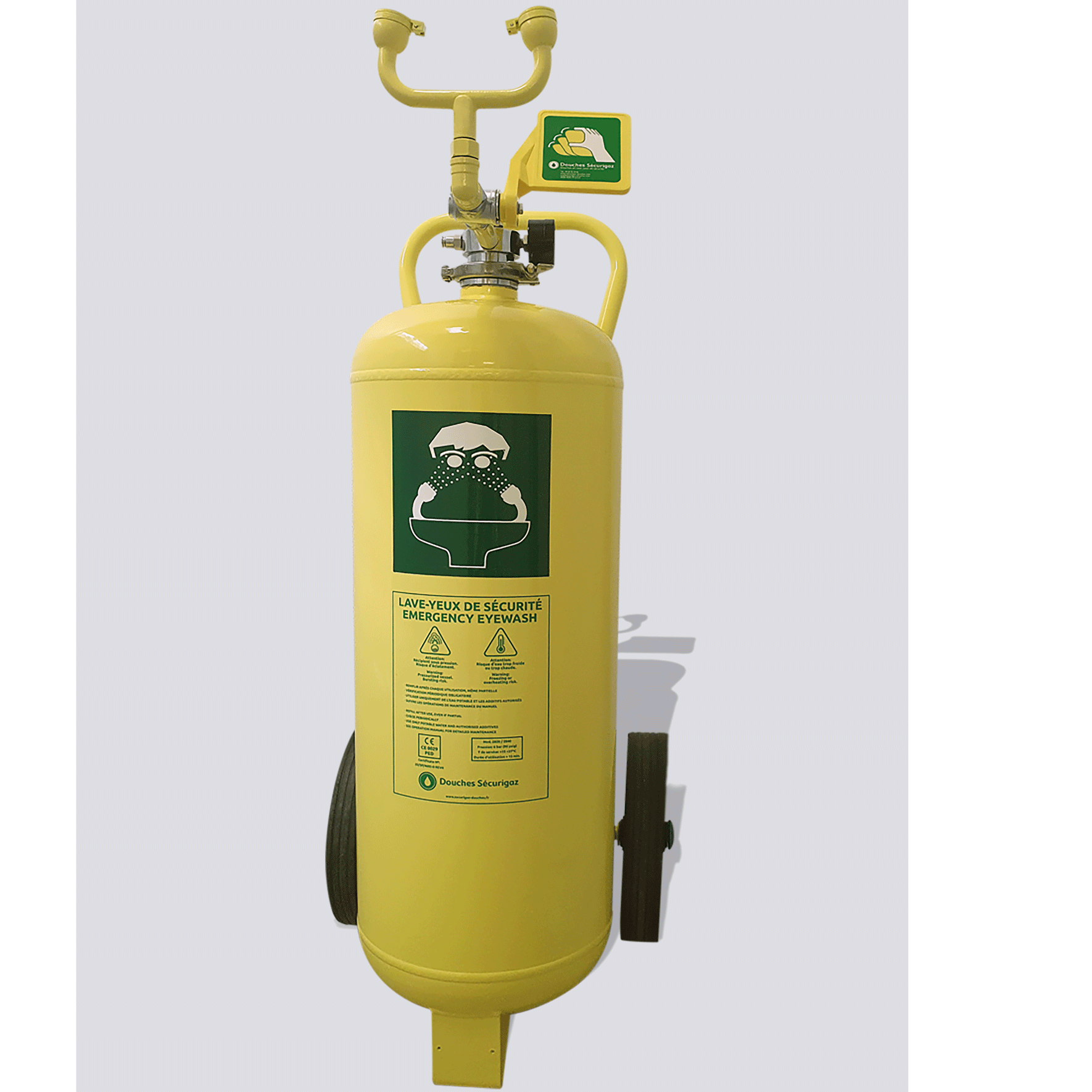 A real solution when a connection to the water network is not possible, this heavy steel eye wash assembled on a transport trolley allows a 15-minute rinse in the event of aggressive projection on the face and/or eyes. This equipment is put