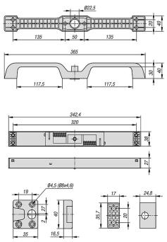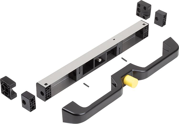 The handle with locking unit can be used for 1.5m wide drawers. The thickness of the rail must be at least 17.5 mm. The device can be mounted in two positions. Front mounting to hold the drawer in place and rear mounting to hold and lock the drawer.