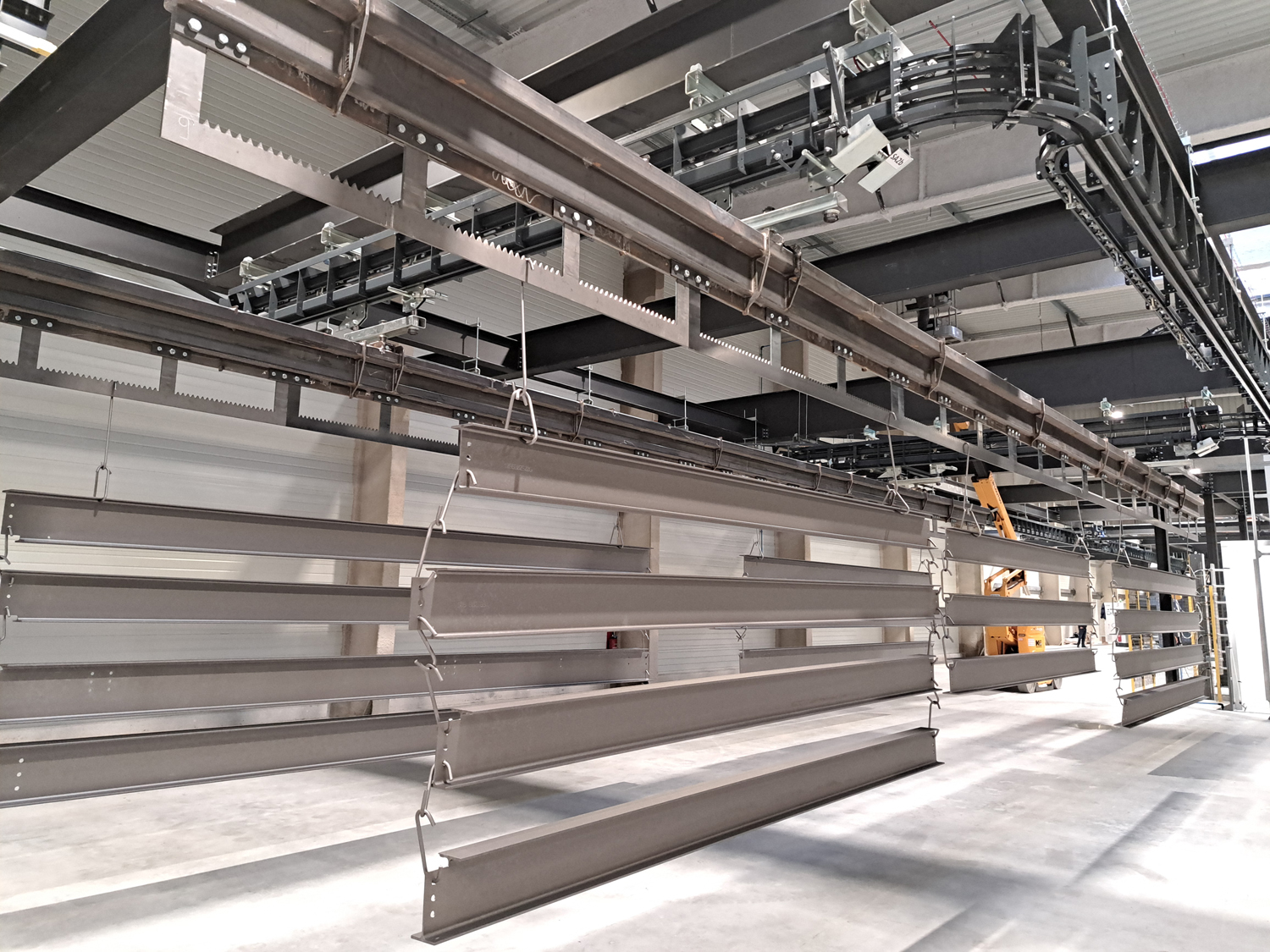 The motorized overhead conveyor allows the automatic transfer and storage of bulky parts and products.