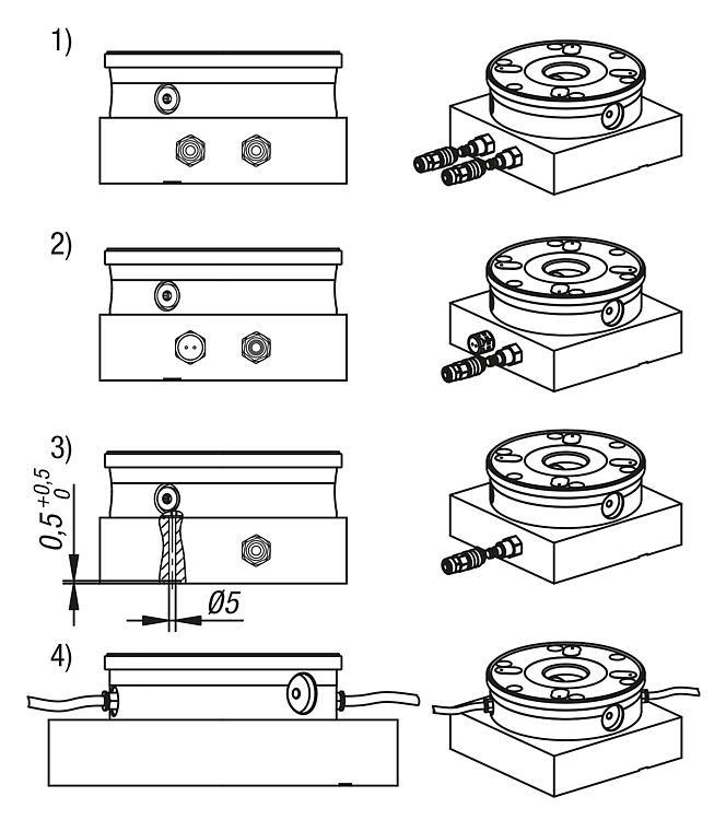 1) Connection and use of the turbo function in the base plate in addition to the "Open" connection. The clamping module can thus be tightened with a brief pulse of air if necessary. (Recommended)