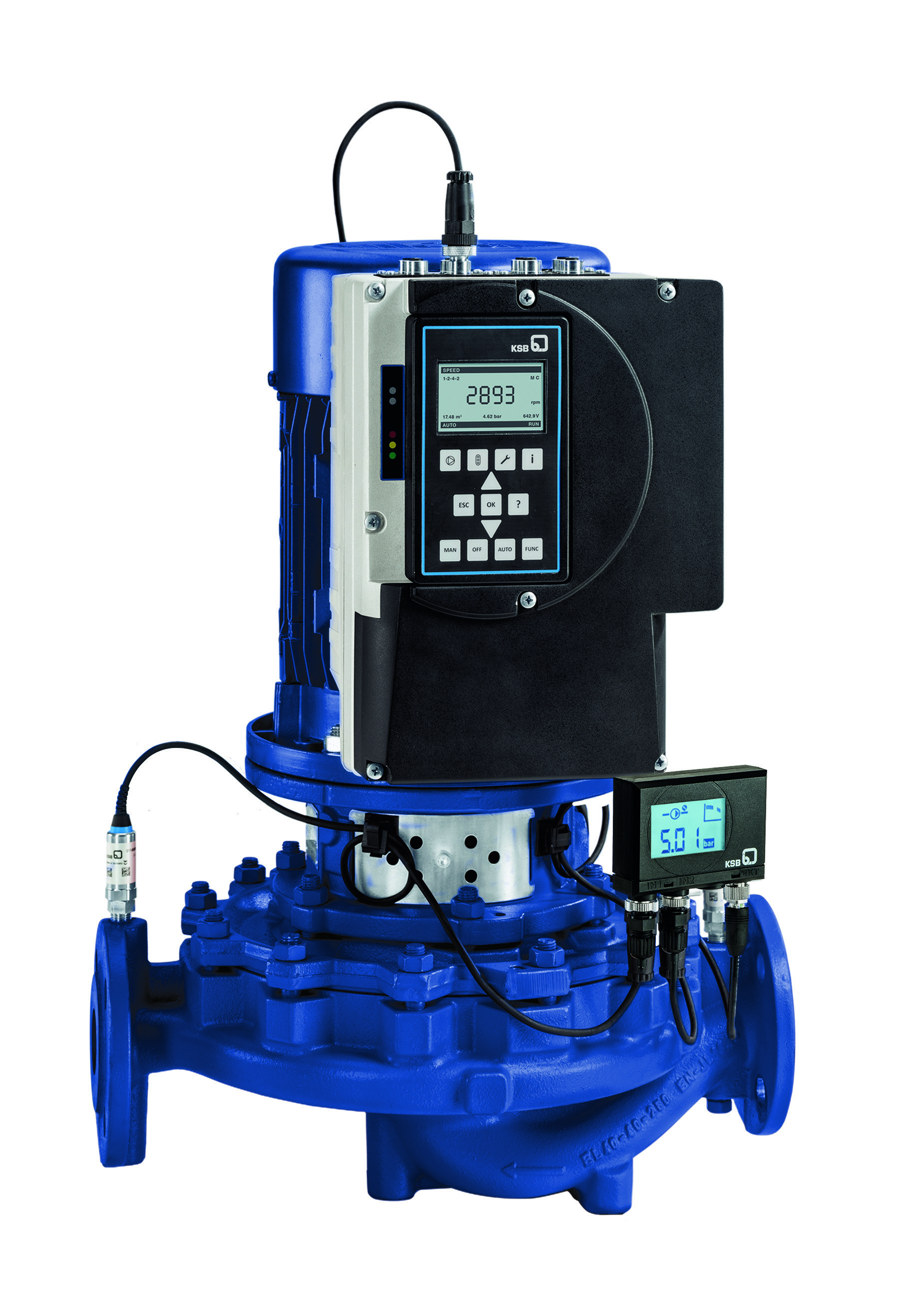 Single-stage volute pump in in-line construction with magnetless KSB SuPremE motor, efficiency class IE4/IE5 and PumpDrive frequency inverter, rigidly coupled pump shaft and motor shaft.