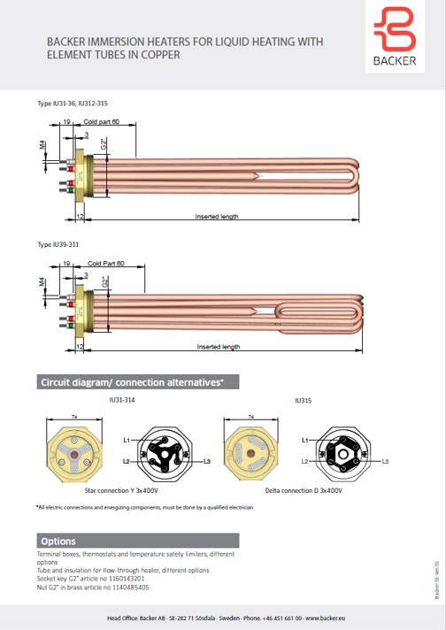 The immersion heaters consist of 3 Backer tubular heating elements brazed to a screw cap.