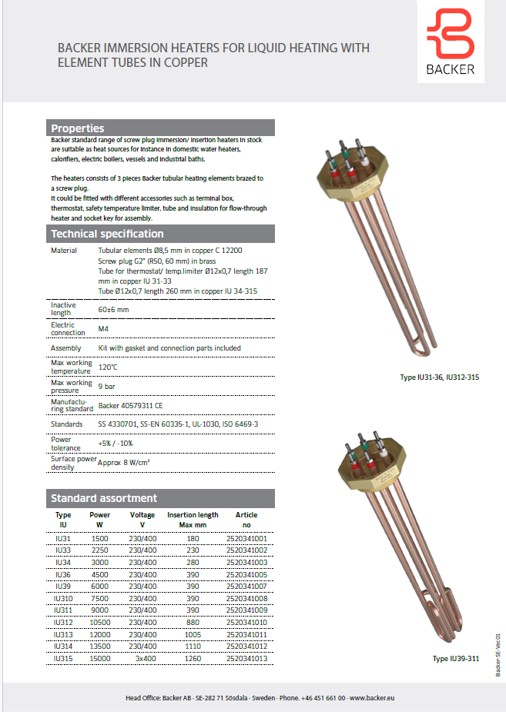Backer standard range of threaded plug immersion heaters / immersion heaters in stock which are suitable as heat sources, for example in domestic water heaters, electric boilers, industrial tanks and baths.