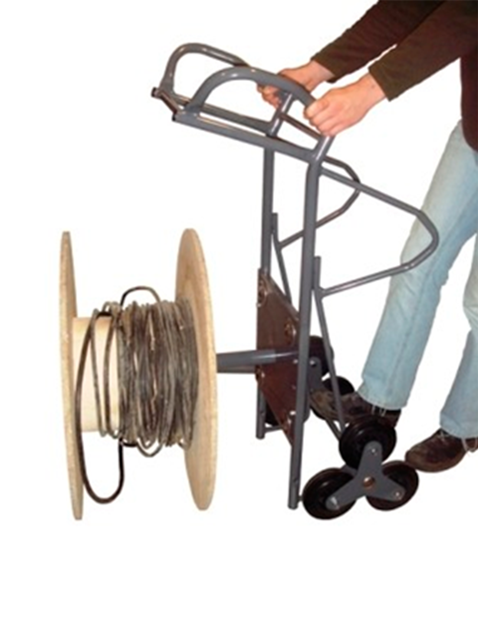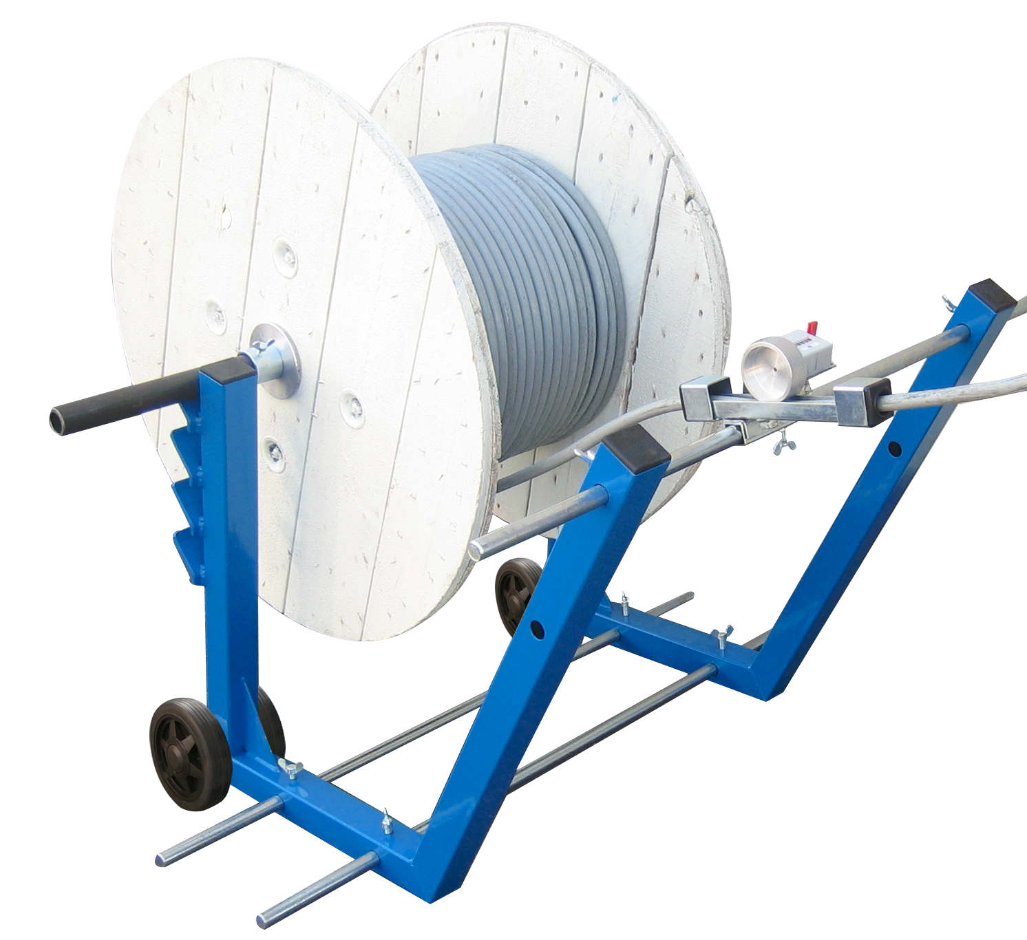 Inwinding trolley for loading, moving and unwinding a cable drum.