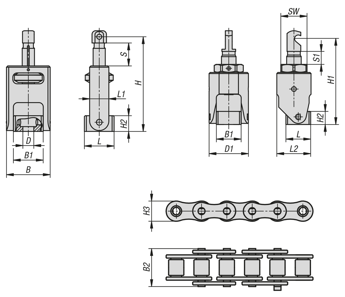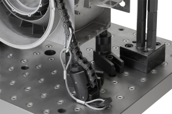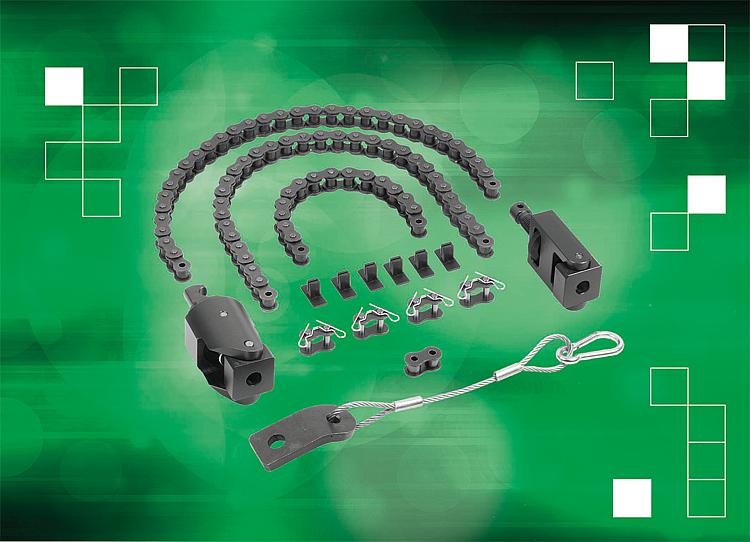 Material: Steel clamping hook. Steel stop. Steel roller chain. Finish: Hardened steel. Application: The chain length and clamping force can be preset on the stop using the knurled nut. The required torque is set on the clamping hook. Scope of delivery: Chain tensioner set 04211-15: - Clamping hook. - Stop. - 4x roller chains (2x 492 mm, 1x 238 mm, 1x 15.9 mm). - 4x closing links with connecting pins. - 6x plastic snap-on elements. - Fastening set for tension chains. Chain tensioner set 04211-40: - Clamping hook. - Stop. - 4x roller chains (1x 991 mm, 1x 483 mm, 1x 229 mm, 1x 25.4 mm). - 4x closing links with connecting pins. - 6x plastic snap-in elements. - Fastening kit for tension chains. Accessories: Steel roller chains for chain tensioner kits 04211-03. Steel tensioners for chain tensioner kits 04211-06. Steel V-shaped elements for chain tensioner kits 04211-09. T-slot nuts DIN 508 range extension, 07060. Hexagon socket head cap screws DIN EN ISO 4762, 07160. Please note: - The opening angle of the chain should not exceed 30°. - Maximum permissible tightening torques.