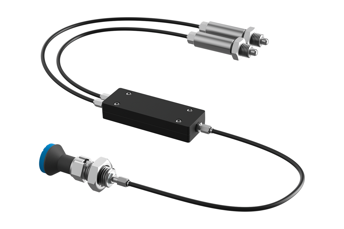 The Bowden cable collector allows three Bowden cables to be combined. For example, it allows two indexing fingers to be actuated with a single control element. Thanks to its reversible use option, an indexing finger can also be actuated by two control elements. To do this, simply pull on one of the two control elements and the indexing finger engages.