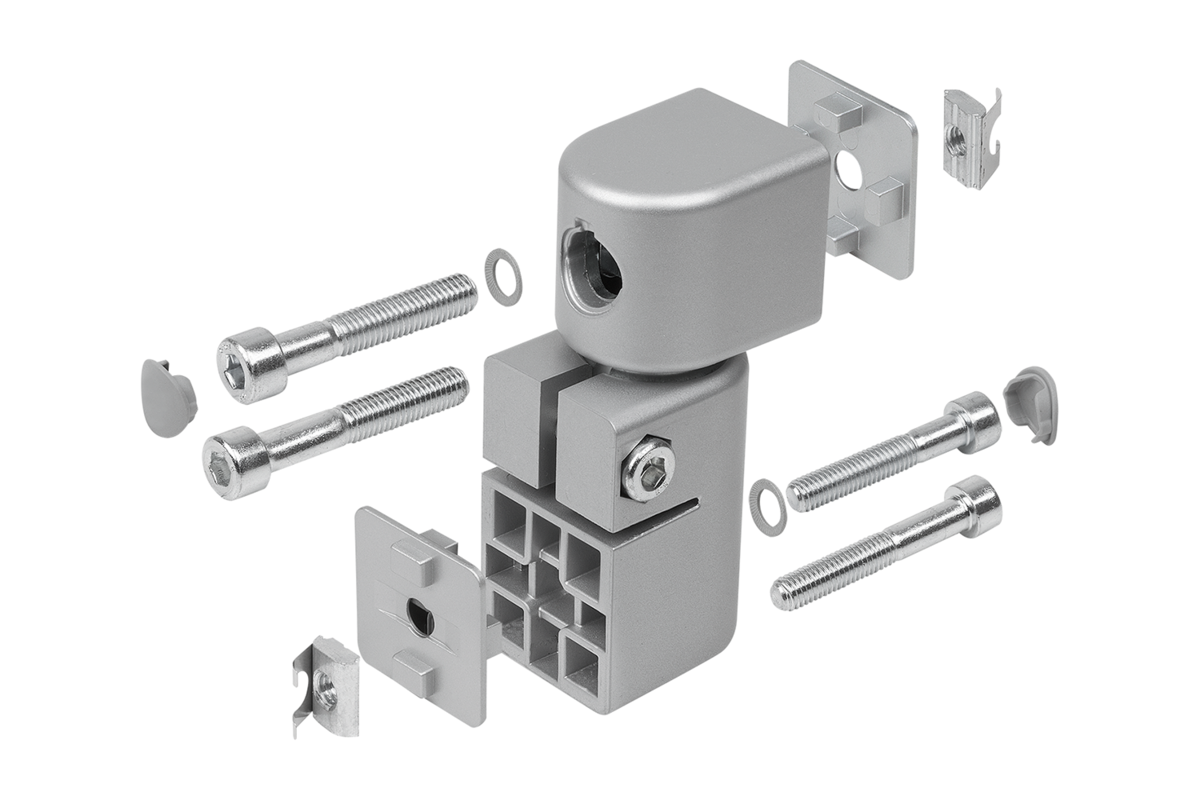 The friction joint side can be fixed to the profile in the longitudinal, transverse or frontal direction. For frontal mounting, the core hole must have an M8 thread (min. depth 15 mm). For mounting on flat surfaces, simply do not use the supplied mounting plates.