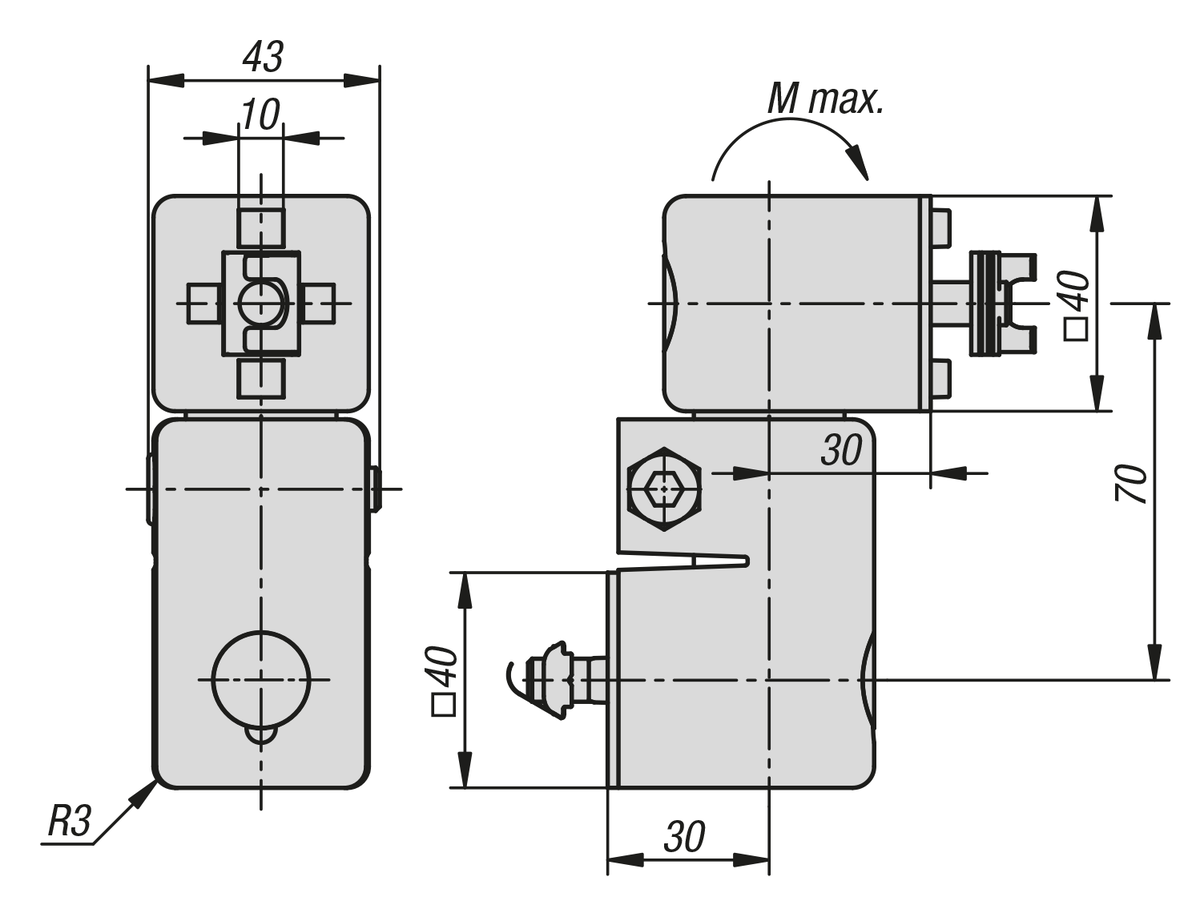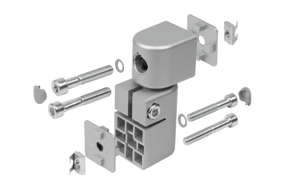 Friction joints for the construction of individual swivel arms using aluminium profiles. These friction joints are characterised by an adjustable friction torque. Their friction resistance can be continuously adjusted using a set screw. Can be rotated 360°. Modular dimension 40 mm.