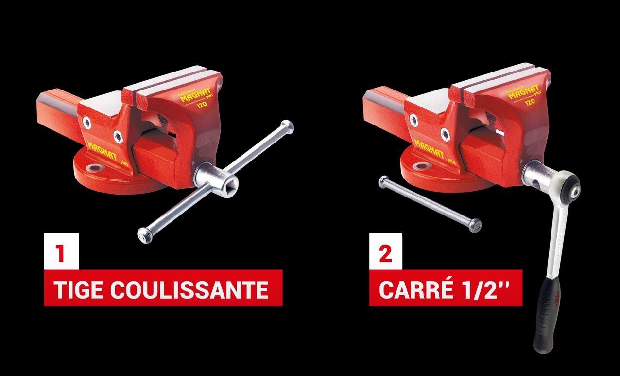Durlach Tube quality vice. With welded, milled and hardened pipe clamping jaws (52-58 HRC). Specially designed for working with pipes. Forged base. Forged, hardened, unbreakable steel, round shape, does not injure, extra large opening with adjustable slide, measuring scale, large hardened anvil (50-56 HRC) for straightening and upsetting work. Jaws with additional swivel jaw holders (from 120 mm). Two clamping systems: the exclusive MDS system, which ensures clamping of the vice with a 1/2” square drive ratchet. This allows you to easily clamp bulky workpieces and in difficult positions. The classic clamping with a removable sliding handle.