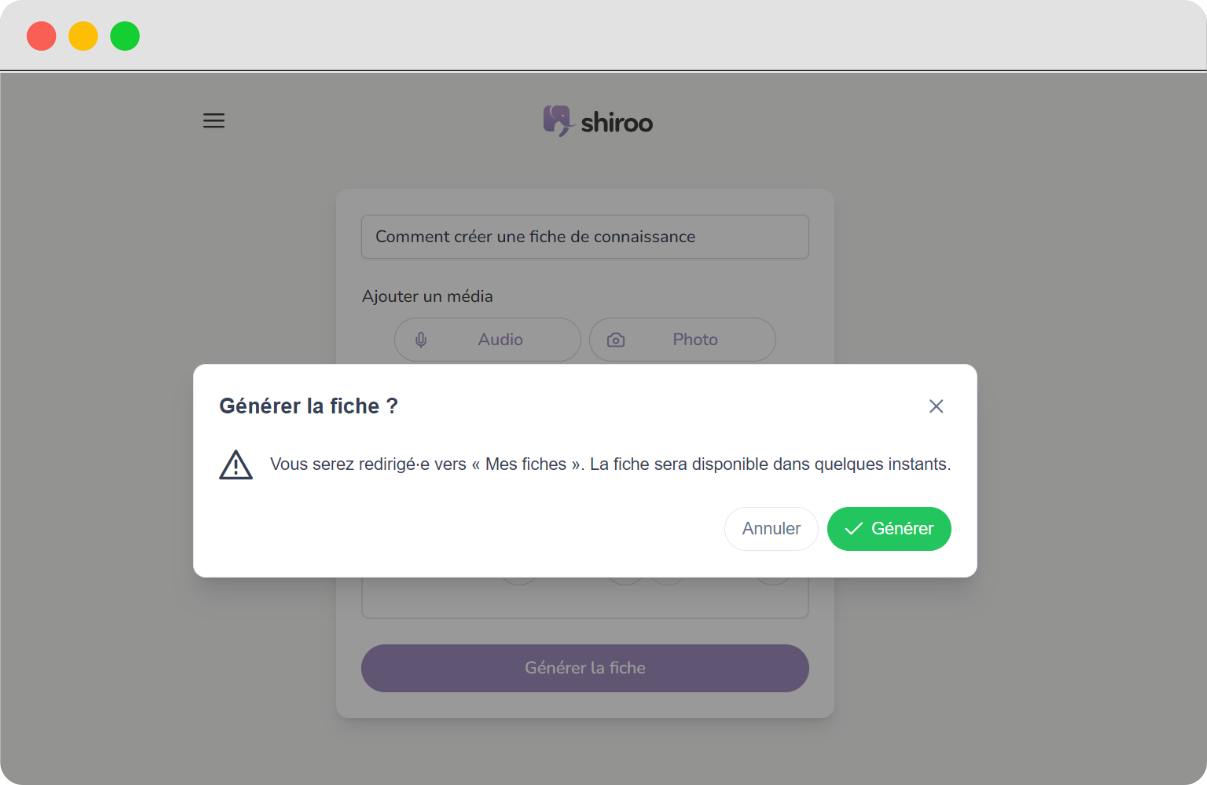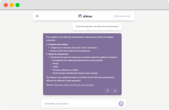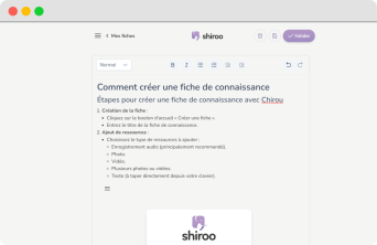Shiroo is as comprehensive as it is easy to use. Talk to Shiroo, it automatically captures and structures information in the form of knowledge cards, distributes them to the targeted people and makes them accessible via a voice and text chatbot. An interaction as natural as chatting with a colleague.