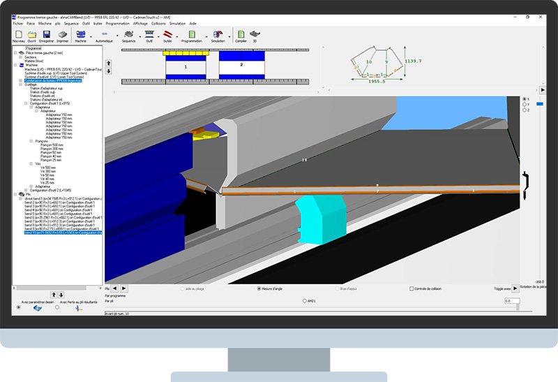 Almacam Bend allows offline programming without interruption of production, of a large number of press brakes. Thanks to powerful 3D simulation tools, the definition of the bending sequence, the installation of the tools and the positioning of the stops are automatically carried out in an efficient and safe manner.
