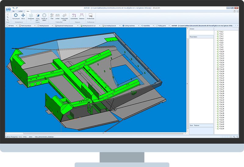 The Unfold module is dedicated to importing CAD models and unfolding sheet metal parts. The flat geometries obtained are used by Almacam for programming cutting machines and punching machines ( Almacam Cut , Almacam Punch ) as well as programming press brakes ( Almacam Bend ). A folded part programmed in Almacam Bend can be reimported by applying the fold and dimension modifications induced by the use of real folding tools.