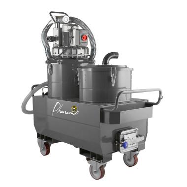 Equipped with a 400-volt three-phase side-channel turbine, this vacuum cleaner provides 3 kW of power, a vacuum of 3,200 mmH²O, and a flow rate of 318 m3/h. Its high power allows it to operate continuously on production lines.