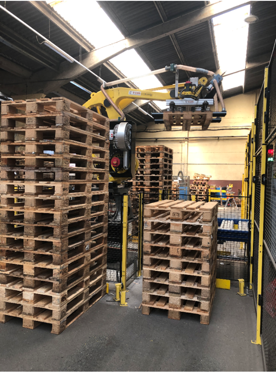 FANUC robot - Modular suction gripping system - Pallet tracking and recentering - Stacking and traceability - Driver evacuation thanks to the DCS robot