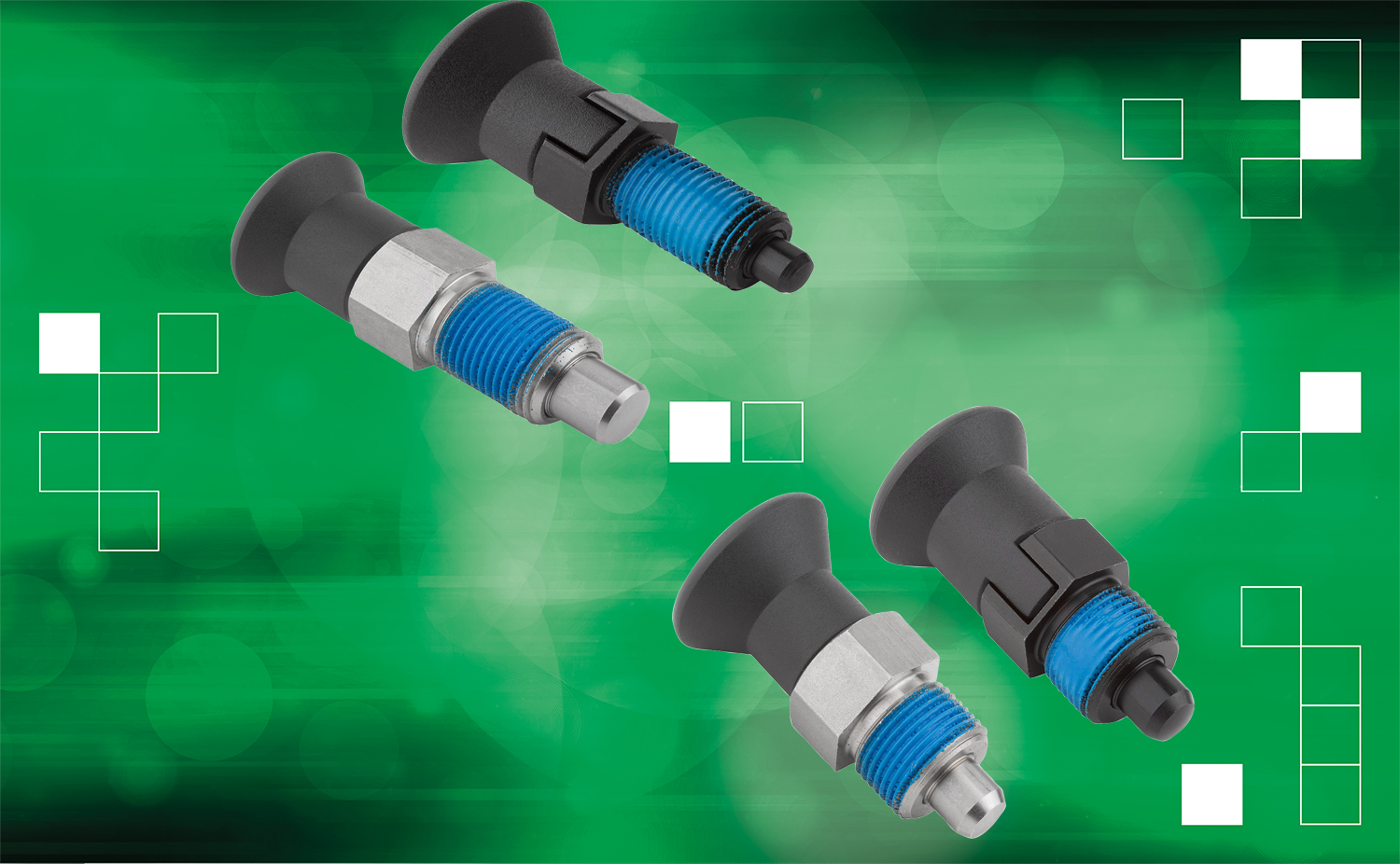Material: Steel finish: Screw and indexing pin, free-cutting steel. Stainless steel finish: Threaded sleeve 1.4305. Indexing plunger 1.4034. Dark gray thermoplastic knob. Blue polyamide thread lock Finish: Steel finish: Indexing plunger hardened, ground and burnished. Stainless steel finish: Hardened, ground and natural indexing plunger.