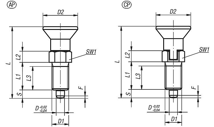 Indexing plungers are used when transverse movement must be avoided. Unblocking the indexing pin is obtained by pulling the button. To maintain this release, use the CP form.