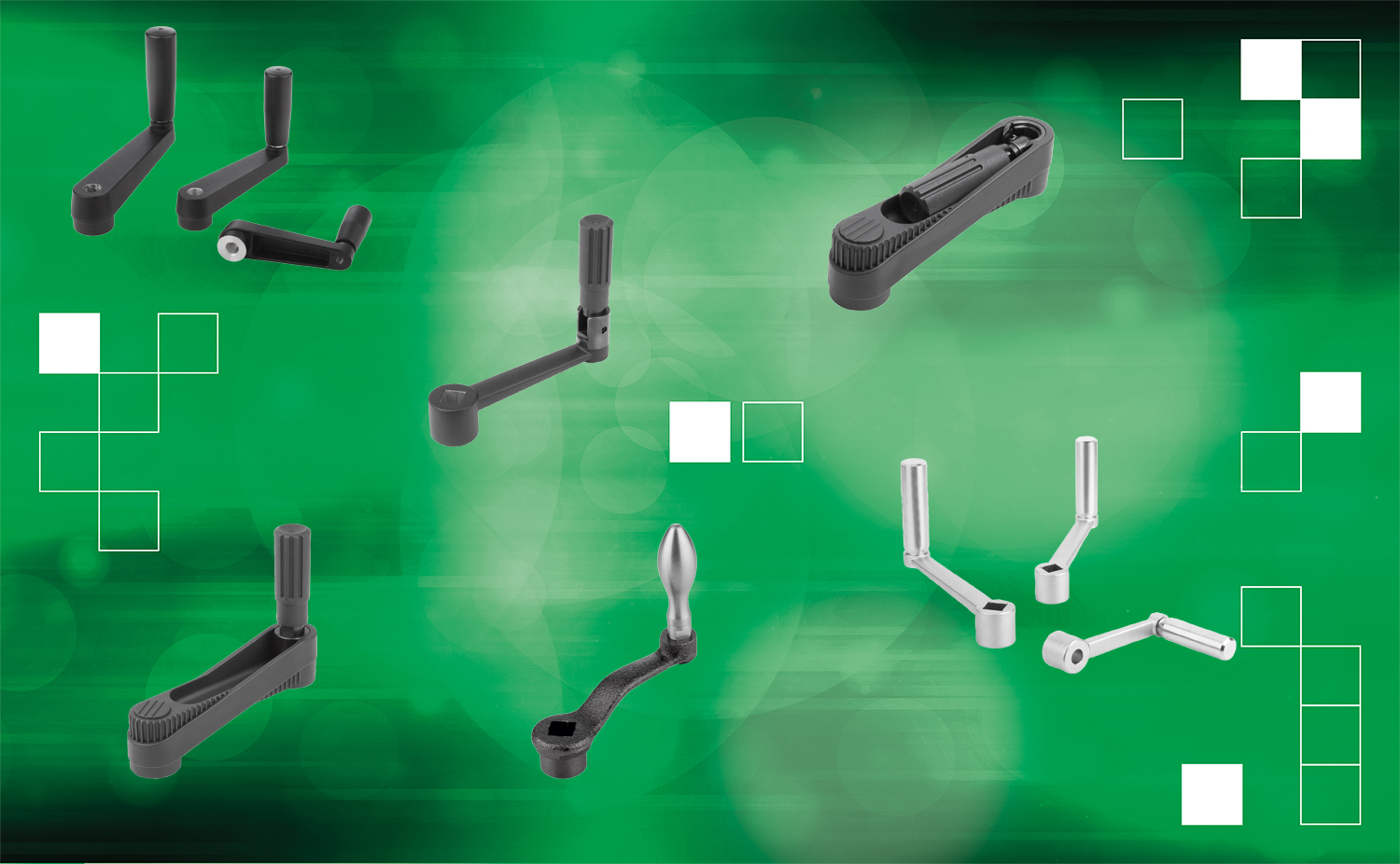 -06480 Undercut crank similar to DIN 468: Crank body: malleable cast iron or spheroidal cast iron. -06490 Straight crank similar to DIN 469: Crank body: malleable cast iron or spheroidal cast iron. -06492 Aluminum crank: Body: aluminium. Revolving cylindrical handle: Thermoplastic. -06500 Crank handle with retractable cylindrical handle: Thermoplastic, dark grey. -06502 Crank handle with cylindrical safety handle: Crank body and handle in dark gray thermoplastic. -06503 Aluminum crank with rotating cylindrical handle: Crank AlSi9Cu3 3.2