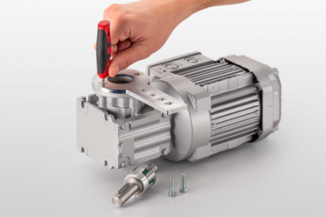 The AC motor D16 is a quality electric motor, equipped with an integrated Spiroplan® gearbox. The right-angle gearbox is available with six fixed ratios for different belt speeds. In combination with an optional frequency converter, the conveyor speed is precisely adjustable. The unit consisting of an asynchronous machine and a permanently installed bevel gearbox facilitates assembly. In addition, the aluminum housing is very light, quiet and durable. The D16 AC motor has a high efficiency IE3 according to DIN EN 60034:30-2009. The drive unit is connected to the conveyor on the right or left. The engine mounting kit 8 40 D16 is used for assembly. A few manipulations are enough to modify the position and the orientation. A safety shutter closes the unused side of the hollow motor shaft to ensure safe operation.