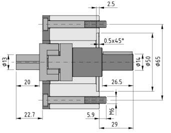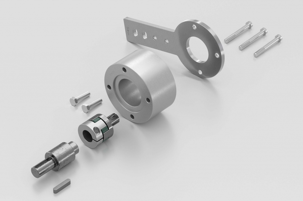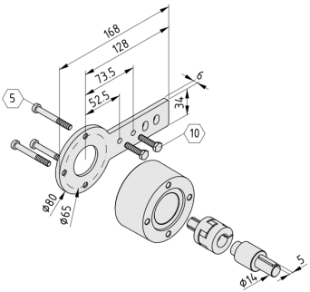 Expansion hub coupling D16/d13, Al/Ku Torque support 8 40, galvanized steel Coupling housing D80/d50 BON, Al 3 screws Chc M6x50-DIN 6912, galvanized steel Drive shaft D14, St 2 hexagonal screws M6x25 -ISO 4017, zinc-plated steel Key DIN 6885-A-5x5x25, St Motor mounting kit 8 40 D14 connects a D14/D11 bevel gearbox to the drive pulley of a belt or toothed belt conveyor . It is installed on the right or left side of the conveyor on the housing of the coupling kit. The gearbox is screwed onto the coupling housing and can be positioned in 90° increments. The drive shaft is inserted into the hollow shaft of the gear unit without additional machining. The expanding hub coupling compensates for an axial offset of the drive pulley.