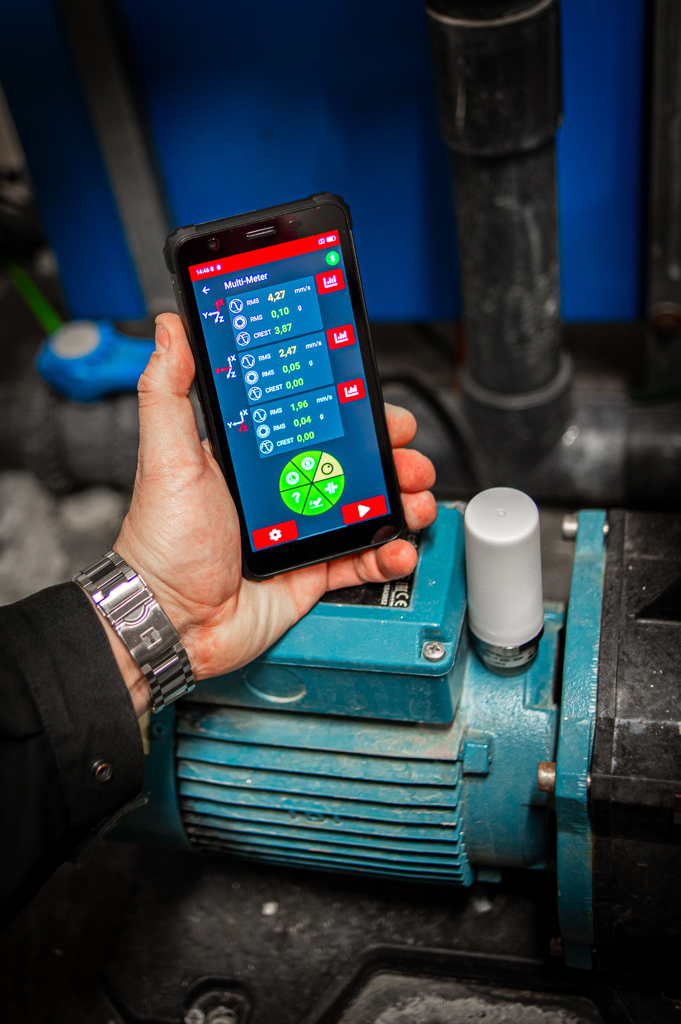 It is a vibration analyzer that works with a wireless triaxial sensor and a rugged smartphone with embedded data processing software.