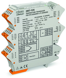 WAGO continues to expand its 2857 series JUMPFLEX® signal conditioner offering with the arrival of two new temperature converter modules. Universal, their input signal is compatible with RTD probes (Pt10 to PT2000, 2, 3 or 4 wire versions), C to T thermocouples, potentiometers and resistors. The temperature image is then converted either into a current or voltage analogue signal, or transmitted via an RS485 MODBUS RTU serial link (depending on the module chosen).