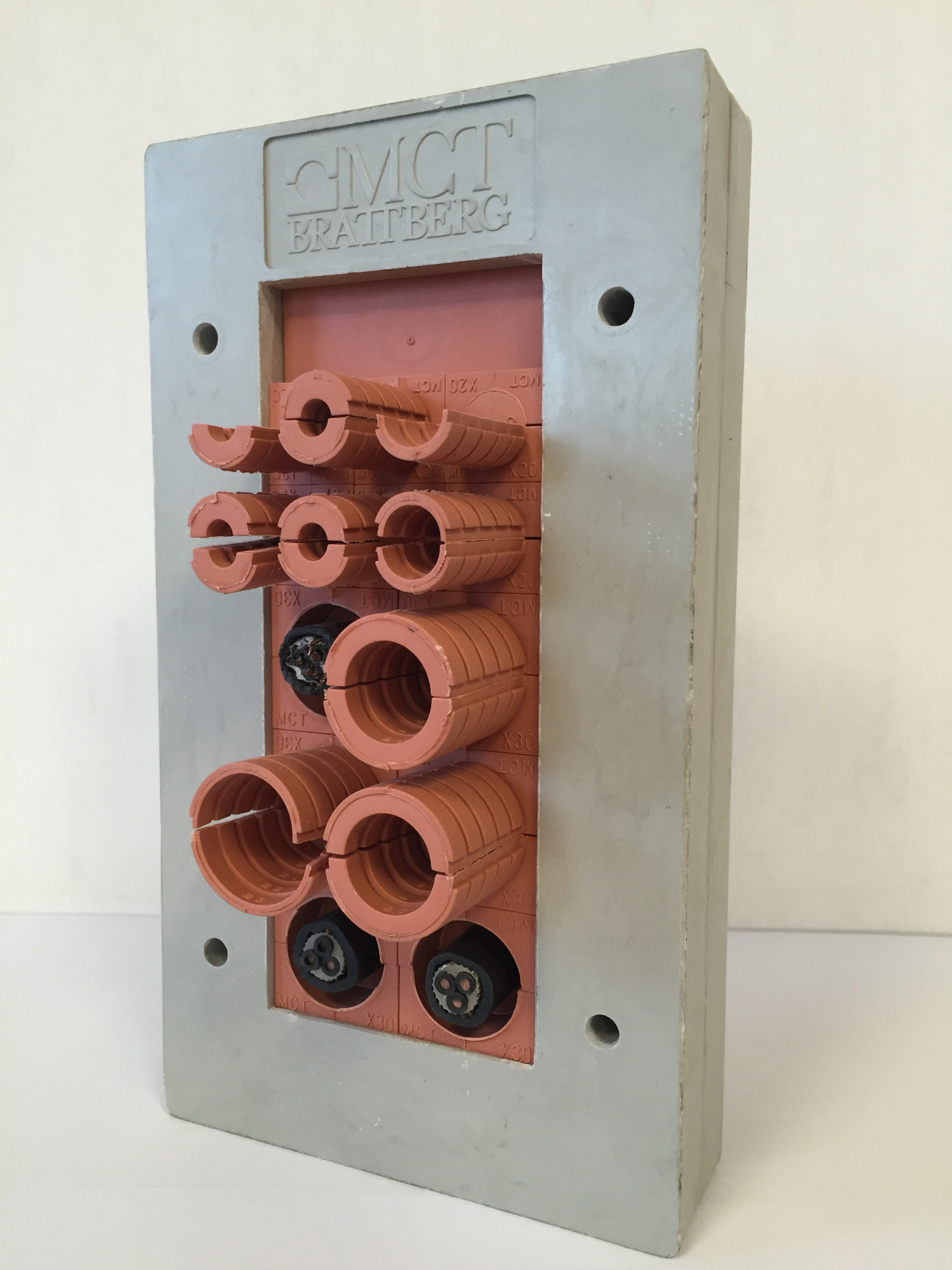 Plug & Play multiple cable gland system. It is made of a composite frame, and benefits from fire integrity for 1 hour. This solution can be integrated into electrical boxes, shelters, etc. Easy to install and multiple cable sizes.