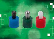 The plastic spring side plungers are available in three different designs, with light, medium or heavy spring force – visually characterized by the colors blue , red and green . When it comes to pins, users have the choice between hardened and burnished steel, stainless steel and plastic (thermoplastic). The spring force must be chosen according to the requirements of the particular application. Forces between 10 N and 160 N can be achieved. |