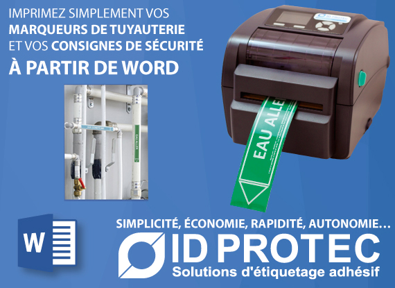 Imprimez vos étiquettes, marquages, instructions, consignes de sécurité, marqueurs de tuyauterie...sur des rubans adhésifs jusqu’à 10 cm de large.