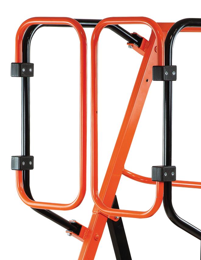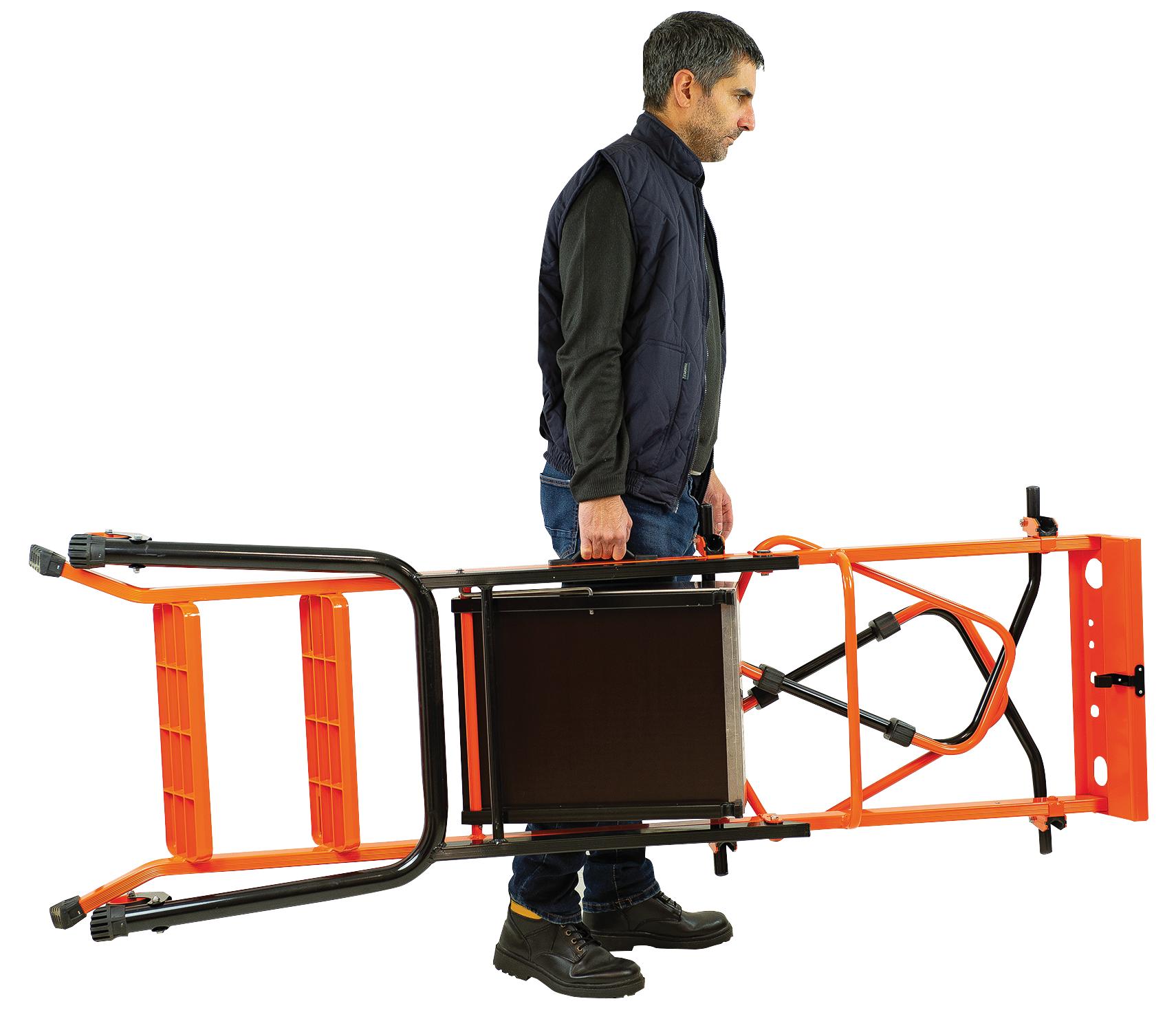 - Poignée de transport intégrée, équilibrée et escamotable qui permet de porter facilement la plateforme pliée