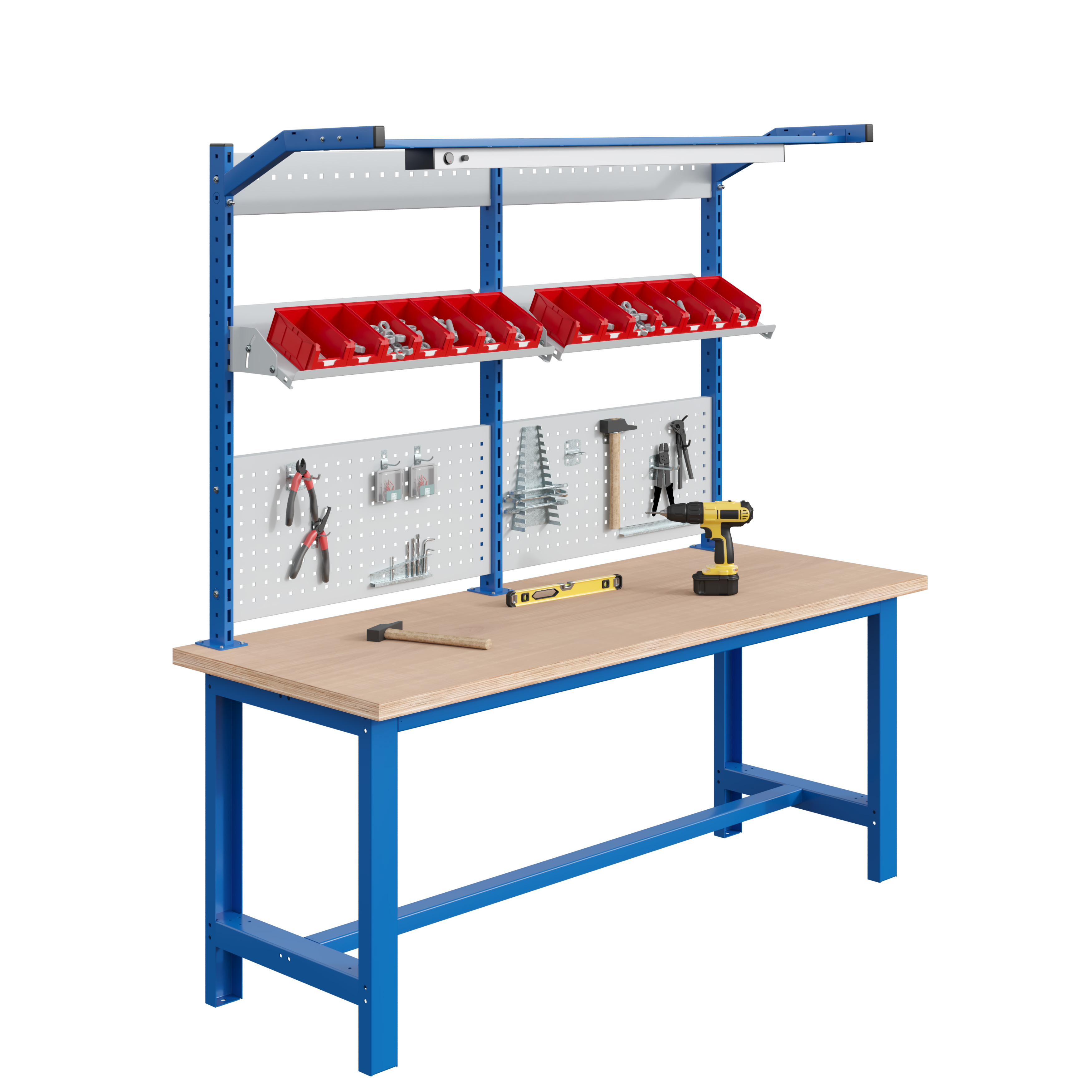 Établi robuste pouvant supporter une charge de 1500kg, conception en tôle d'acier pliée. Traverse horizontale assurant stabilité au poste de travail. Aucune vis ou boulon apparent pour assurer une meilleure protection de l'utilisateur cotre les blessures. Peinture en poudre époxy structurée fine texture polymérisée au four à 180°C pour une meilleure résistance aux chocs. Différents plateaux disponibles.