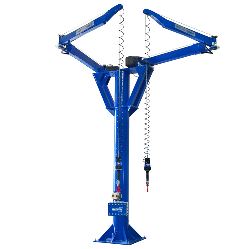 - 2 bras articulés avec rotation de 270° du 1er bras et 330° du second - Portée 4000 mm - Débattement vertical du crochet : 3500 mm - Mode balancier pour manipuler la charge à la main sans effort - Balancier IN-LIFT® 80 kg - Commande sensitive coaxiale offrant une réactivité naturelle