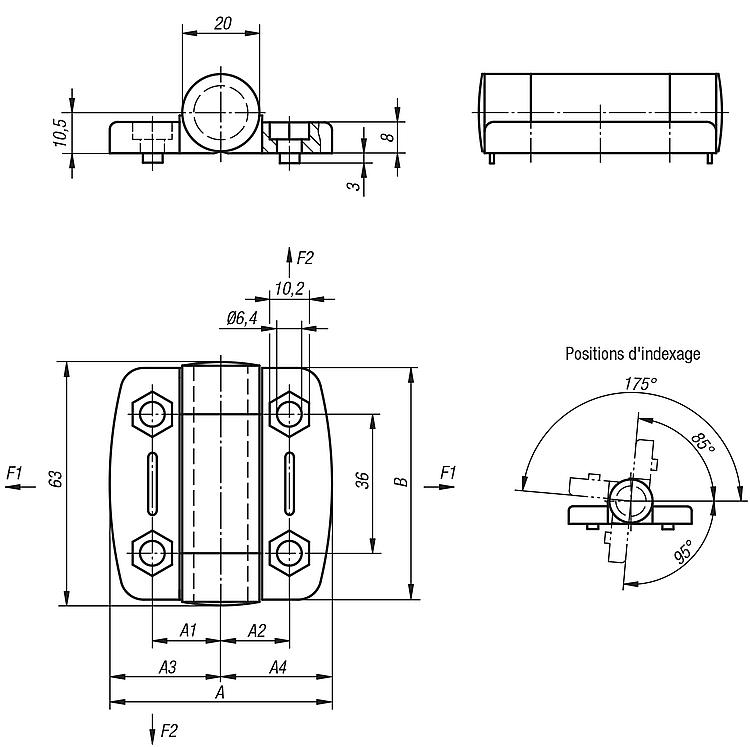 Les charnières sont équipées d'une fonction de verrouillage. Celle-ci permet de les verrouiller dans quatre positions et de maintenir ouverts ou hermétiquement fermés les portes et clapets. Les charnières sont disponibles avec et sans broche-guide pour profilés aluminium.