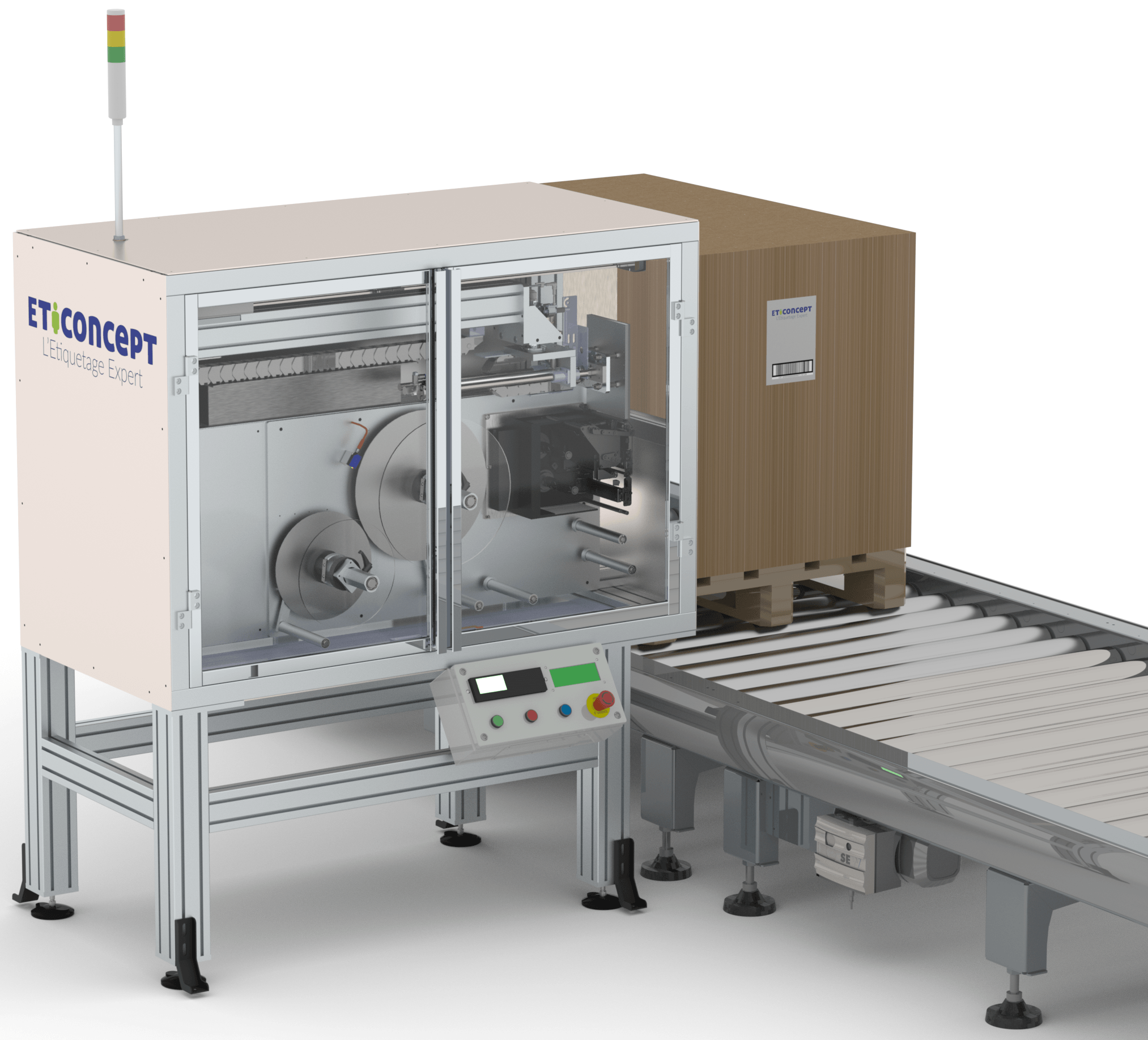– Système d’impression pose pour palette – Pose par vérin sur 2 à 3 faces adjacentes – Possibilité de pose en format « portrait » ou « paysage » Le système ETI 4000 2F/3F fabriqué par ETICONCEPT permet d’éditer et d’appliquer deux étiquettes (format maximum 160 x 220 mm) sur les faces adjacentes d’une palette avec un seul arrêt du convoyeur. Il est également possible d’étiqueter 3 faces de la palette (devant, côté, derrière) avec deux arrêts du convoyeur, la plaque d’application de l’étiquette pouvant pivoter sur 2 côtés (rotation de +/- 90° pour pose frontale et/ou arrière) ainsi qu’un mode portrait/paysage (en option)