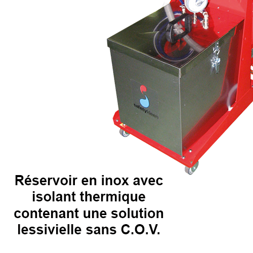 - SÉCURITÉ & ENVIRONNEMENT : grâce à un produit de nettoyage chauffé sans C.O.V. et sans C.M.R. et un réservoir en inox avec isolant thermique qui maintient longtemps la température de la solution de nettoyage.