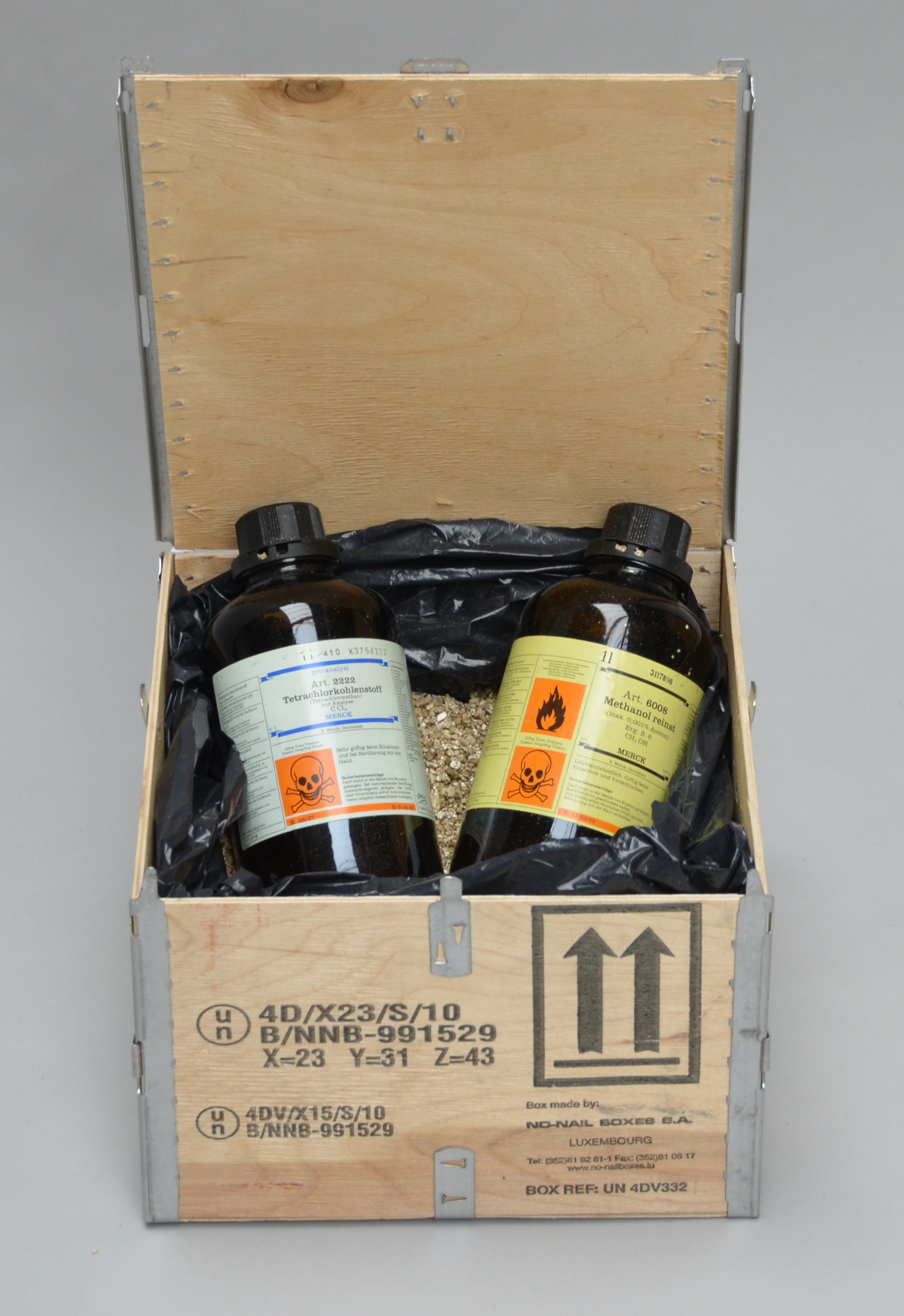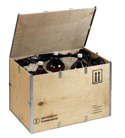 Comme toutes les caisses homologuées pour le transport de produits dangereux, l’EXBOX DG est : - Homologuée en X, Y et Z pour toutes les classes (1 à 9 sauf la 7) - Prévue pour tout type d’emballage intérieur (bouteilles en verre et en plastique, boîtes métalliques, etc.) - Livrée et stockée à plat - Conforme à la norme NIMP15 - Adaptée à tout type de transport : air (IATA), terre (ADR), mer (IMDG), fer (RID) - Disponible en stock