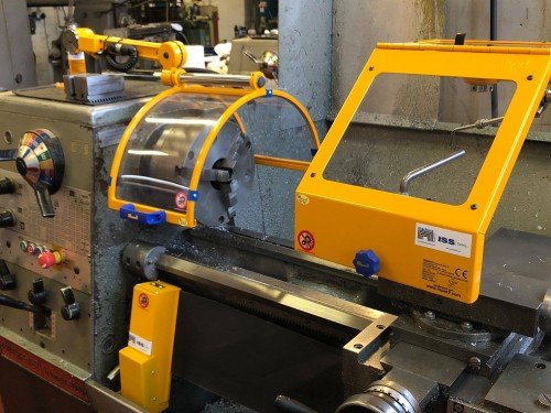 Protecteur pour mandrin de tour en polycarbonate avec micro-interrupteur.