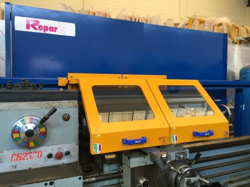Protecteur double écran en tôle d'acier et verre feuilleté, coulissant sur un guide indépendant L-2500mm.