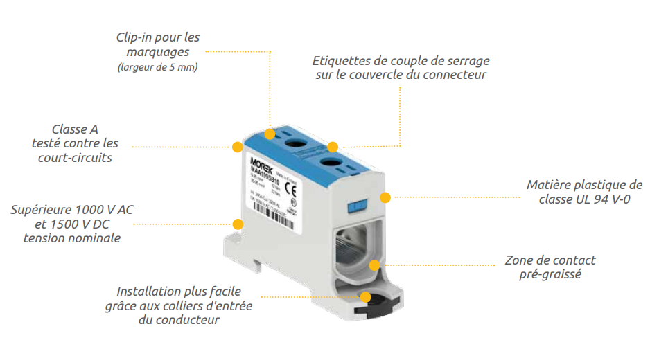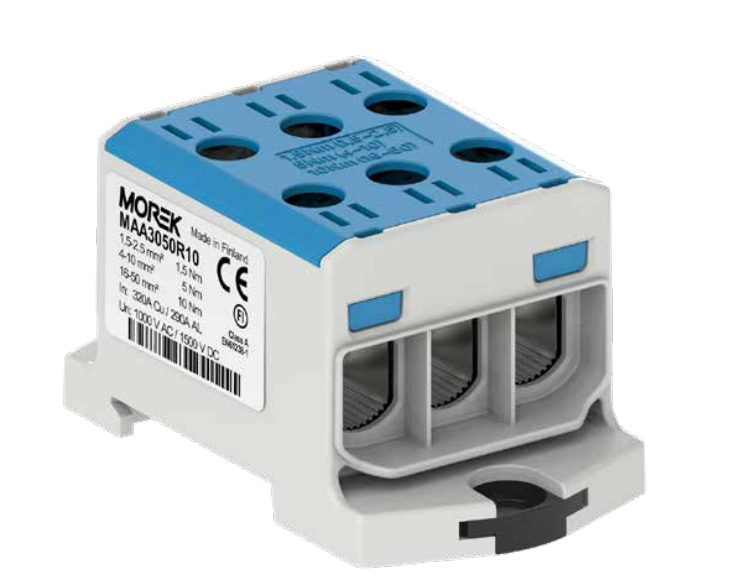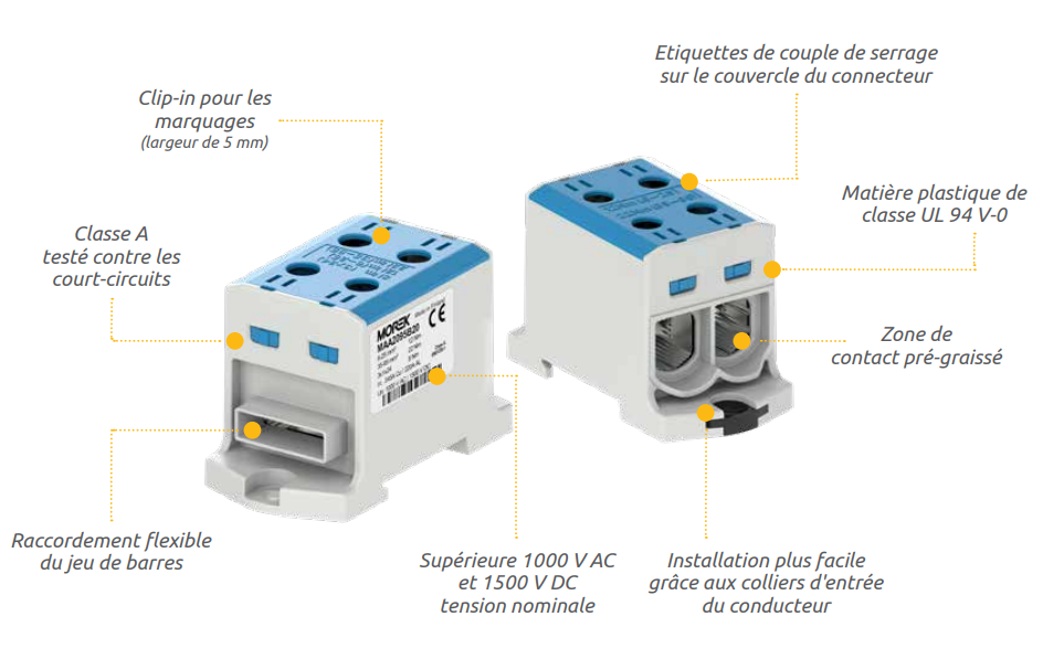 Nos blocs de jonction sont conçus pour les conducteurs en cuivre et en aluminium. Ils conviennent à tous les types de conducteurs d'une section allant jusqu'à 300 mm². Plusieurs fils de cuivre peuvent être placés sur les blocs de bornes universelles en fonction du type de borne respectif. L'indice de protection IP des blocs de jonction est IP20.