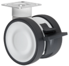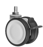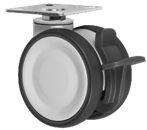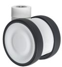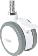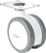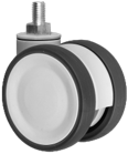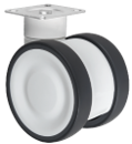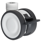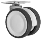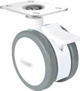 Gamme TWINEX : Roulette pivotante et pivotante à double blocage. Monture en polyamide, pivotement par un roulement à billes, roue double en polyamide, bandage polyuréthane gris, moyeu à roulement à billes.